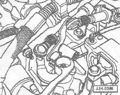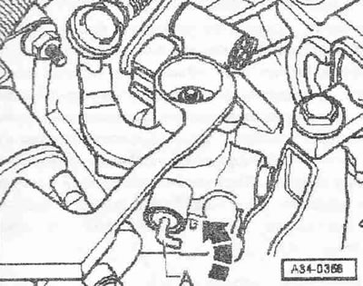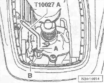 Зафиксировать рычаг переключения следующим образом: установить рычаг в положение холостого хода влево в "коридор" 1/2 передач. Ввести стопорный штифт «Т10027 А» через отверстие «А» в отверстие «В». Убедиться в том, что трос выбора передач и трос переключения передач вставлены в фиксатор троса без механических напряжений.