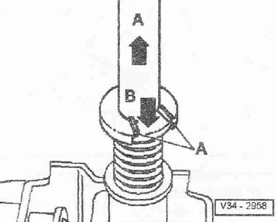 Для снятия и установки стопорной шайбы «А» переместить рычаг переключения передач «в направлении стрелки А» и одновременно переместить вниз до упора распорную втулку отверткой «в направлении стрелки В».