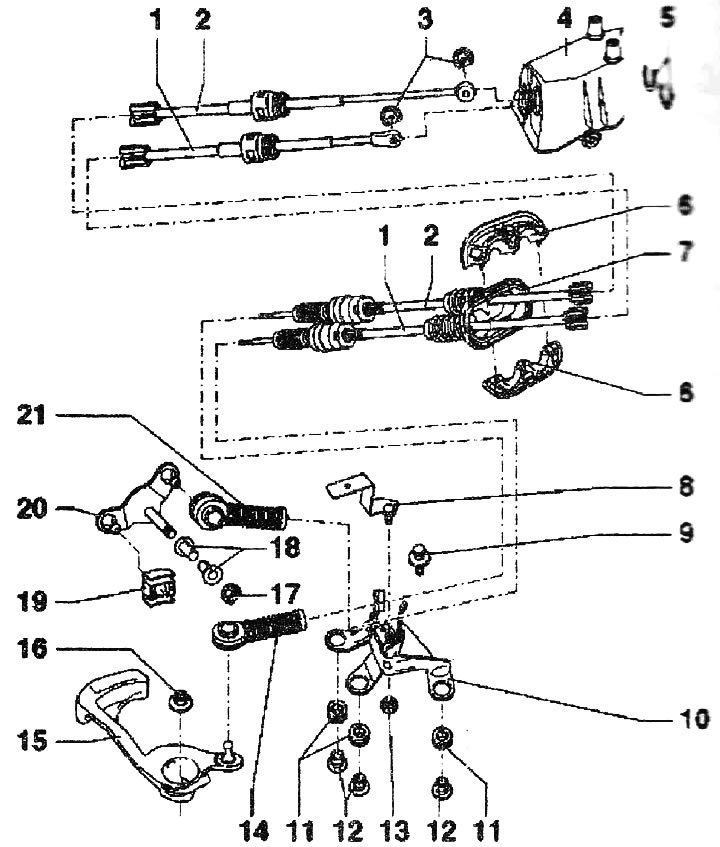 21. Фиксатор троса для тросового привода селектора на промежуточном рычаге. После снятия заменить