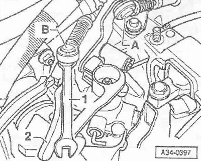 Отжать фиксатор троса выбора передач «А» вильчатым ключом «1» и троса переключения передач «В» вильчатым ключом «1» и клещами «2» от КП.
