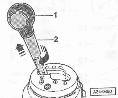 Провернуть втулку «2» на 90° «в направлении стрелки» до упора и снять наконечник рычага переключения передач «1» вместе с втулкой по направлению вверх. Теперь можно разъединить наконечник рычага переключения передач и втулку.