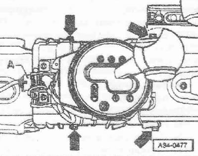 Разомкнуть электрическое штекерное соединение «А». Отвернуть болты «стрелки» и снять привод механизма переключения передач.