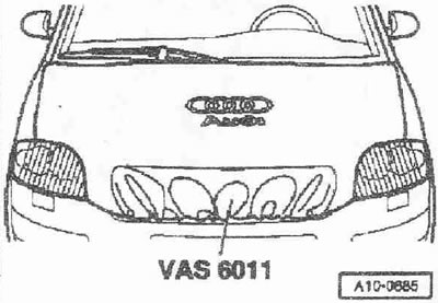 Отсоединить кабель массы от АКБ. Вымыть капот снаружи и покрыть его защитным чехлом. Изнутри разблокировать сервисную крышку. Разблокировать крышку капота и вытянуть ее немного вперед. Натянуть защитный чехол «VAS 6011» на крышке капота. Снять крышку капота и положить ее на защитный чехол «VAS 6011». Отвернуть вакуумный ресивер прибл. на 1/2 оборота. Уровень гидравлического масла в бачке увеличивается. Извлечь хомут трубчато-шланговых магистралей из переключателя передач с помощью отвертки.