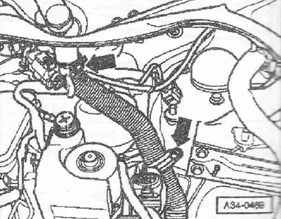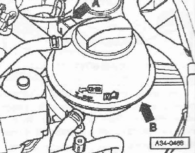 Отсоединить штекерный разъем «стрелка А». Отвернуть расширительный бачок ОЖ «стрелка В» и отложить в сторону с подключенными шлангами ОЖ.