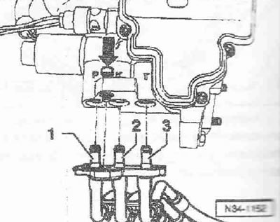 Извлечь трубо-шланговую магистраль «1» и «2» из блока переключения передач. Поз. «3» не учитывать. Открытые магистрали и патрубки закрыть чистыми заглушками из набора заглушек для двигателя «VA.S 6122».