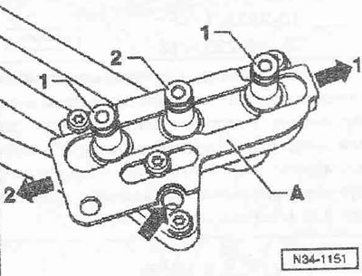 Открытые магистрали и патрубки закрыты чистыми заглушками из набора заглушек для двигателя «VAS 6122». Нанести метки трубчато-шланговые магистрали для правольной обратной установки. Извлечь трубчато-шланговые магистрали «1» и «2» из монтажной пластины, переместив для этого скользящую деталь «А» в «направлении стрелки 1».