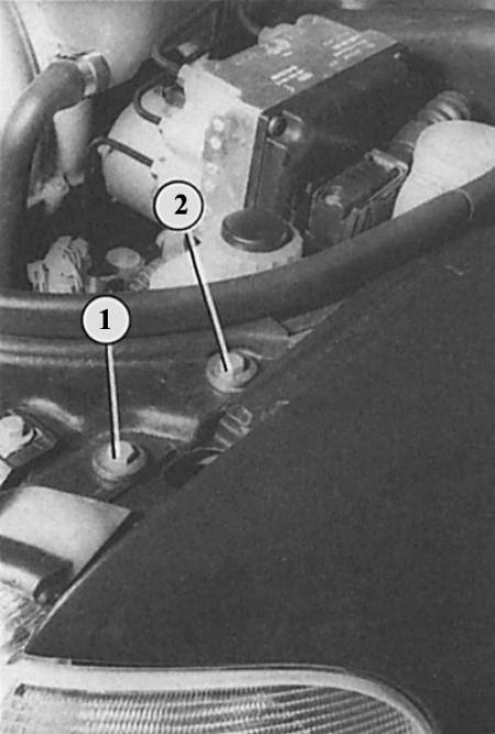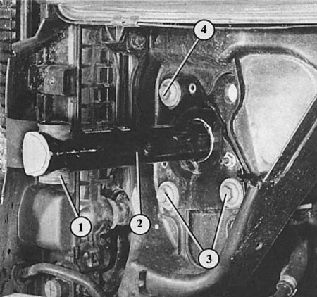 Przywracanie przedniej części pojazdu do pozycji roboczej: Numer "2" oznacza wkręcenie specjalnego narzędzia 3369, składającego się z długiej śruby i rury. W liczbach "1", "3", "4" a "5" oznacza śruby, które należy poluzować, aby przesunąć przednią część.