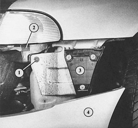 Po zdjęciu zderzaka (4) widać: 1 – śrubę mocującą błotnik; 2 – jedna ze śrub mocujących reflektor; 3 – wspornik zderzaka bocznego.