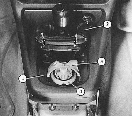 Aby uzyskać dostęp do śruby regulacyjnej dźwigni zmiany biegów, należy podnieść kołnierz (2). W tym celu należy zdjąć mankiety z rowków montażowych (strzałki) dolnej ramy. Następnie zdejmij izolację akustyczną (1). Dalej widoczne: