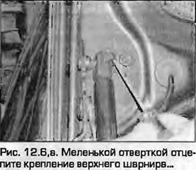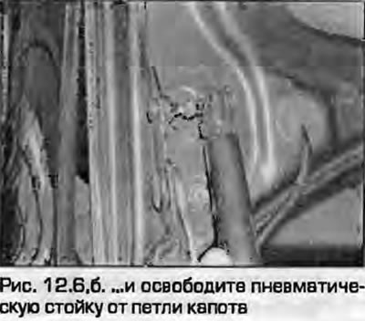 6. Za pomocą małego śrubokręta odczep górne mocowanie zawiasu i zwolnij amortyzator pneumatyczny z zawiasu maski.