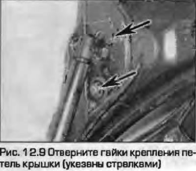 9. Poproś pomocnika o podtrzymanie pokrywy, odkręć nakrętki mocujące zawiasy pokrywy (rysunek 12.9) i uwolnij pokrywę z zawiasów.