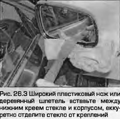 3. Używając szerokiego plastikowego noża lub drewnianej szpatułki, najpierw włóż ją między dolną krawędź szkła a korpus, ostrożnie oddziel szkło od elementów mocujących. Gdy poczujesz, że dolna krawędź odstaje, przesuń szpatułkę do góry i podważ górną krawędź szklanki. Nie należy stosować siły, aby uniknąć pęknięcia szkła lub obudowy (rysunek 26.3).