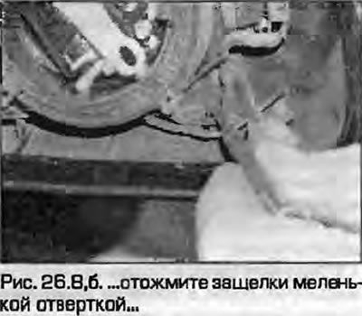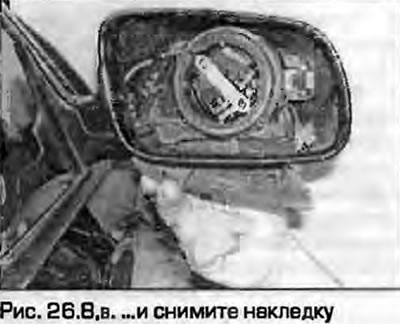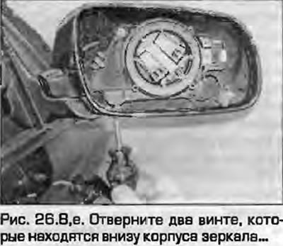 8. Odkręć dwie śruby znajdujące się na spodzie obudowy lusterka, naciśnij zatrzaski małym śrubokrętem i zdejmij pokrywę (rysunek 26,8, a-b).