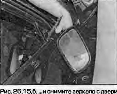 15. Odkręć śrubę mocującą i zdejmij lustro z drzwi (rysunek 26,15, a, b). Przeprowadź złącze przewodów przez otwór w drzwiach i usuń uszczelkę.