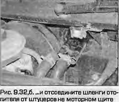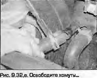 32. Zaciśnij węże odpowiednimi zaciskami. Poluzuj zaciski i ściągnij węże z przyłączy (rysunek 9.32, a, b). Odcedź płyn do pojemnika znajdującego się pod spodem.