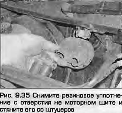 35. Wyjąć uszczelkę gumową z otworu w osłonie silnika, ściągnąć ją z mocowań i wyjąć spod maski (rysunek 9.35).