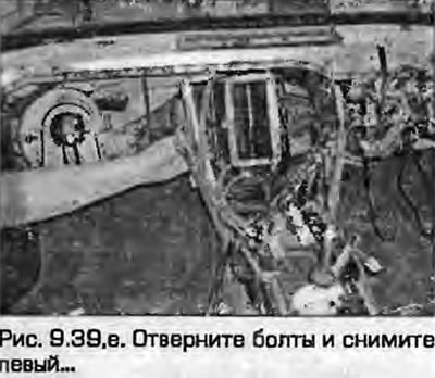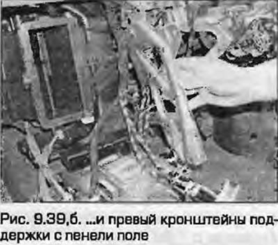39. Odkręć śruby i odłącz lewy i prawy wspornik przedniego panelu od paneli podłogowych (rysunek 9.39, a, b).