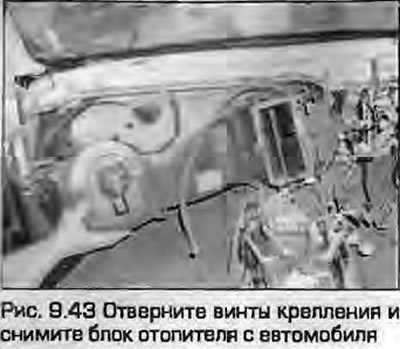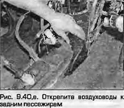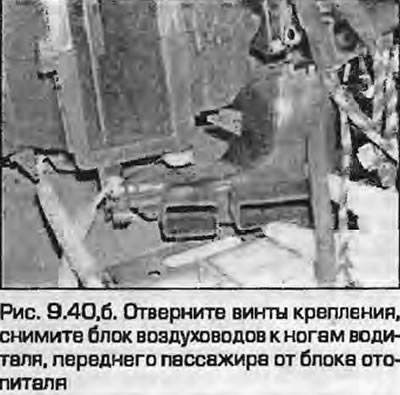 40. Odłączyć kanały powietrzne do tylnych pasażerów od przedniej części jednostki dystrybucji powietrza aż do stóp kierowcy i przedniego pasażera. Odkręć śruby mocujące i wyjmij jednostkę rozdzielacza powietrza z podstawy nagrzewnicy (rysunek 9.40, a, b).