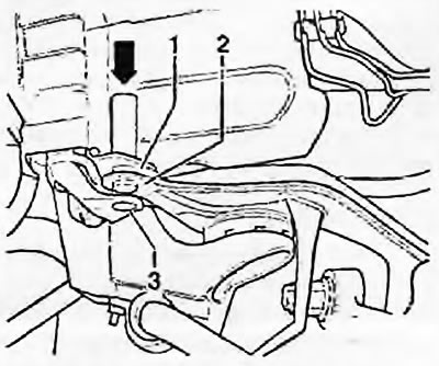 8. Odłączyć wewnętrzne końce obu dolnych wahaczy od ramy pomocniczej zgodnie z opisem w akapit 5. Aby to zrobić, musisz odłączyć tylne narożniki ramy pomocniczej od nadwozia i lekko je obniżyć, aby wyjąć śrubę dźwigni.