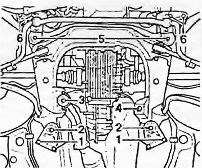Rysunek 7.24. Szczegóły montażu ramy pomocniczej: 1. Śruby tylnego wspornika montażowego; 2. Główne śruby montażowe; 3. Śruby podporowe skrzyni biegów; 4. Śruby podporowe skrzyni biegów; 5. Główne śruby montażowe; 6. Śruby przedniego wspornika montażowego