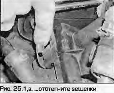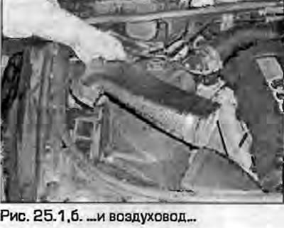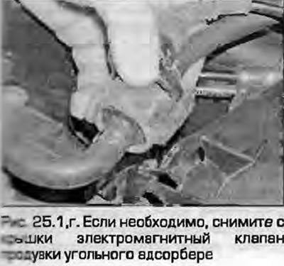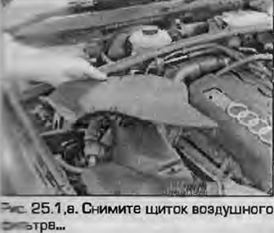 Zdejmij osłonę obudowy filtra powietrza i kanał dolotowy powietrza. Po odkręceniu śrub należy zdjąć górną pokrywę filtra powietrza. W razie konieczności tymczasowo wyjmij zawór elektromagnetyczny opróżniania pojemnika z węglem drzewnym z pokrywy (rysunek 25.1, np). Należy pamiętać, że czujnik MAF jest zamontowany na górnej pokrywie (czujnik masowego przepływu powietrza).