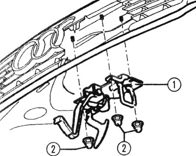 Dolna część zatrzasku maski: Dolna część zatrzasku maski 1 zabezpieczona jest czterema śrubami 2