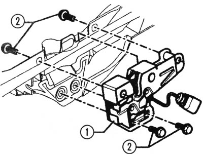 7. Jeśli chcesz zdjąć dolną część zatrzasku maski 1, odłącz linkę Bowdena służącą do odblokowywania i blokowania maski. Następnie odkręć cztery śruby 2 i zdejmij dolną część zamka.