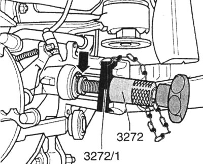 5. Za pomocą specjalnego narzędzia 3272 wciśnij tłok do zacisku. Stopniowo wciskaj tłok do tyłu, mocno go naciskając i obracając śrubę pociągową w prawo. Pasek narzędziowy (strzałka) powinien stykać się z zaciskiem.