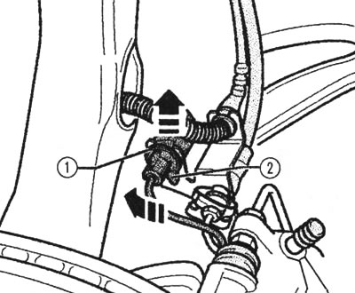 1. Umieść przód samochodu na podstawkach podnośnikowych i zdejmij koła. Zablokuj tarcze hamulcowe przykręcając dwie śruby mocujące koło. W pojazdach ze wskaźnikiem zużycia klocków hamulcowych należy odłączyć złącze 1. W tym celu należy lekko unieść zatrzask blokujący znajdujący się na dole złącza 2, a następnie obrócić go o 90'. Wyciągnij dolną część złącza z uchwytu.