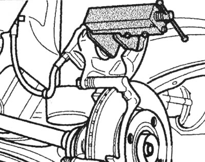 3. Odkręć dolną śrubę mocującą z obudowy zacisku hamulcowego. W tym przypadku należy przytrzymać sworzeń prowadzący.