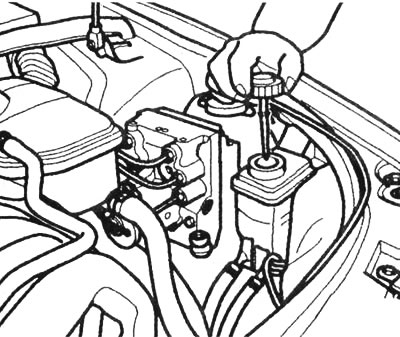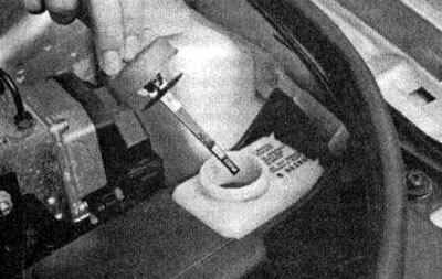 Zbiornik płynu wspomagania układu kierowniczego znajduje się po lewej stronie, przed jednostką sterującą układu zapobiegającego blokowaniu kół