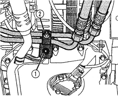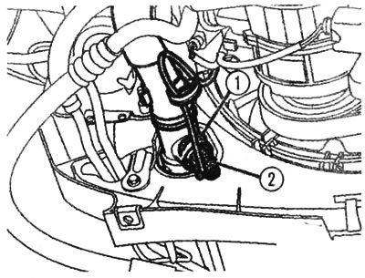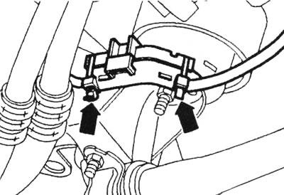 W samochodach z automatyczną skrzynią biegów należy zdemontować uchwyt przewodów płynu roboczego odkręcając nakrętki 1 i 2