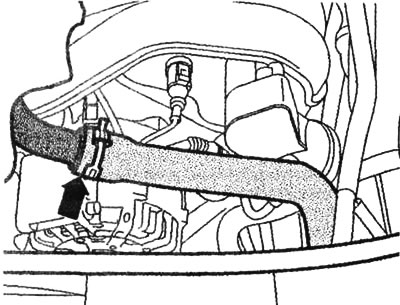 5. Spuść płyn chłodzący tylko z chłodnicy. Następnie należy odłączyć wąż od rury układu chłodzenia (strzałka).