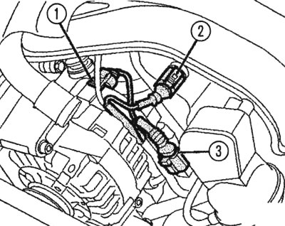 Połączenia wtykowe w generatorze: 1, a także (w przypadku silnika 2,0 l) 2 i 3