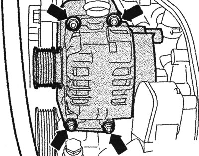 6. Odłącz przewody od generatora (zobacz opis operacji 9 dla silników 4-cylindrowych). Odkręć śruby montażowe i wyjmij generator.