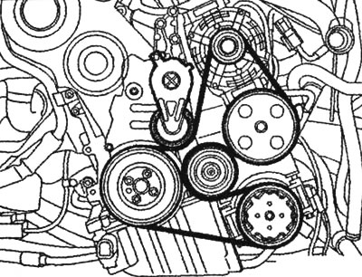 1. Demontaż: Zdjąć górną pokrywę silnika pod kątem do góry. Otwórz pasek wielorowkowy. Przed zdjęciem paska zaznacz kredą lub markerem kierunek jego ruchu. Założenie starego paska w odwrotnym kierunku może spowodować jego uszkodzenie.