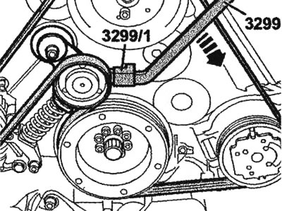 2. Aby poluzować pasek, należy obrócić napinacz w kierunku wskazanym strzałką (3299, 3299/1).
