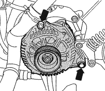 Strzałki wskazują górne i dolne śruby mocujące generator