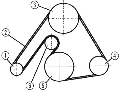 Przejście paska wielorowkowego: 1 - alternator, 2 - pasek wielorowkowy, 3 - pompa łopatkowa wspomagania kierownicy, 4 - sprężarka klimatyzacji, 5 - wał korbowy, 6 - rolka napinająca.