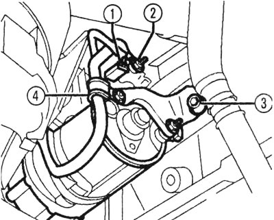 Rozrusznik silnika 4-cylindrowego: 1 - przyłącze rozłączne do zacisku 50, 2 - przewód do zacisku B+, 3 - uchwyt do mocowania rozrusznika do bloku cylindrów, 4 - zacisk do mocowania przewodów.