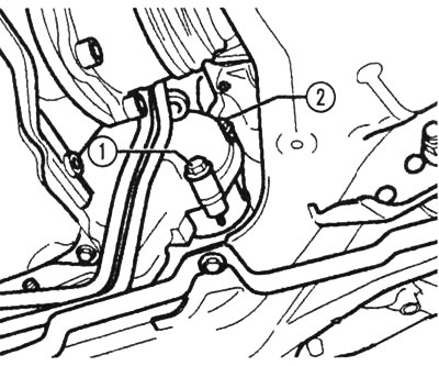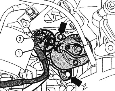 3. W przypadku pojazdów z silnikiem 4-cylindrowym należy wykręcić śruby 1 i 2, a następnie wyciągnąć rozrusznik w dół. W samochodach z silnikiem 6-cylindrowym należy najpierw zdjąć osłonę termiczną 3 z przekaźnika trakcyjnego. Następnie można odkręcić śruby mocujące (strzałki) i wyjąć rozrusznik.