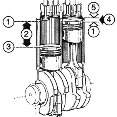 Objętość robocza cylindra 2 rozciąga się od górnego 1 do dolnego martwego punktu 3. Pomiędzy górnym martwym punktem, w którym znajduje się dolna część tłoka w prawym cylindrze na tym rysunku, a łukiem głowicy cylindra 5, znajduje się komora spalania 4.
