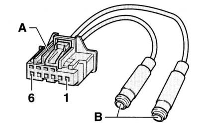 1. Zastosować wtyczkę (A) AUDI 8D0 972 706. Do styków (5) i (6) podłączyć przewody o przekroju 0,25 mm². Podłącz zwykłe zaciski krokodylkowe (B) do pozostałych końców przewodów.