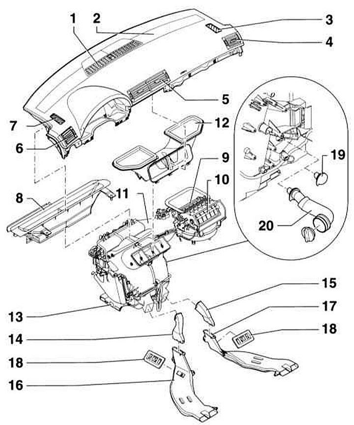 - 20 — Kanał wentylacyjny schowka. Tylko dla pojazdów z lodówką w schowku na rękawiczki