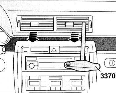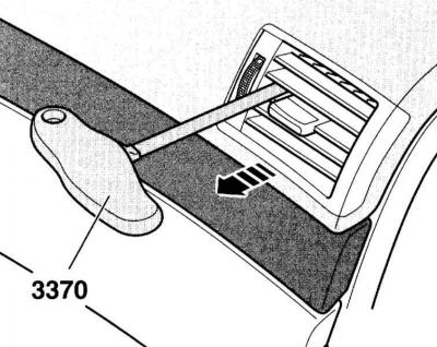 1. Włóż hak AUDI 3370 do środkowej dyszy powietrza i ostrożnie wyciągaj dyszę naprzemiennie od lewej do prawej strony z deski rozdzielczej.