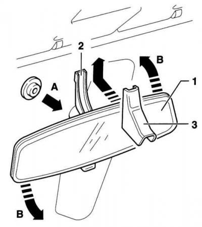 2. Obrócić lusterko (1) o 60 do 90° przeciwnie do ruchu wskazówek zegara (strzałka B), tak aby zwolnić sprężynę blokującą.