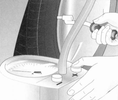 Odkręć osłonę ochronną zaworu do pompowania wystającego z felgi lub kołpaka piasty, a następnie mocno dociśnij końcówkę manometru do zaworu. Odczytaj wskazania przyrządu i porównaj je z zalecanymi Specyfikacje. Należy pamiętać o założeniu nasadki ochronnej, aby zapobiec przedostawaniu się brudu i wilgoci do mechanizmu zaworu. Sprawdź ciśnienie we wszystkich czterech oponach i w razie potrzeby napompuj je do zalecanego ciśnienia.