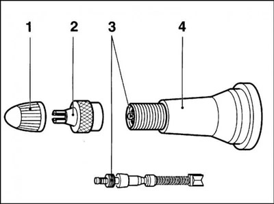 Ostrzeżenie: Do dokręcania zaworu należy używać wyłącznie nasadki ochronnej nr 2. 1 gumowa nasadka ochronna, 4 zawór.