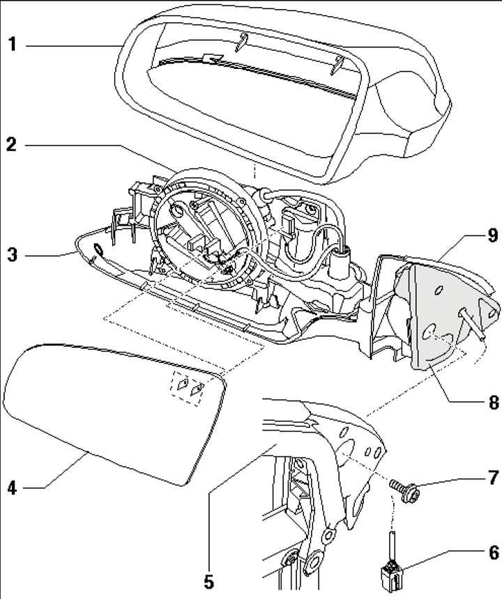 9.1. Części lusterka wstecznego 1. Obudowa lusterka; 2. Silnik elektryczny; 3. Moduł regulacji lusterka; 4. Lustro; 5. Drzwi wejściowe; 6. Złącze; 7. Śruba z podkładką 12 Nm; 8. Uszczelka; 9. Obsługa lustra