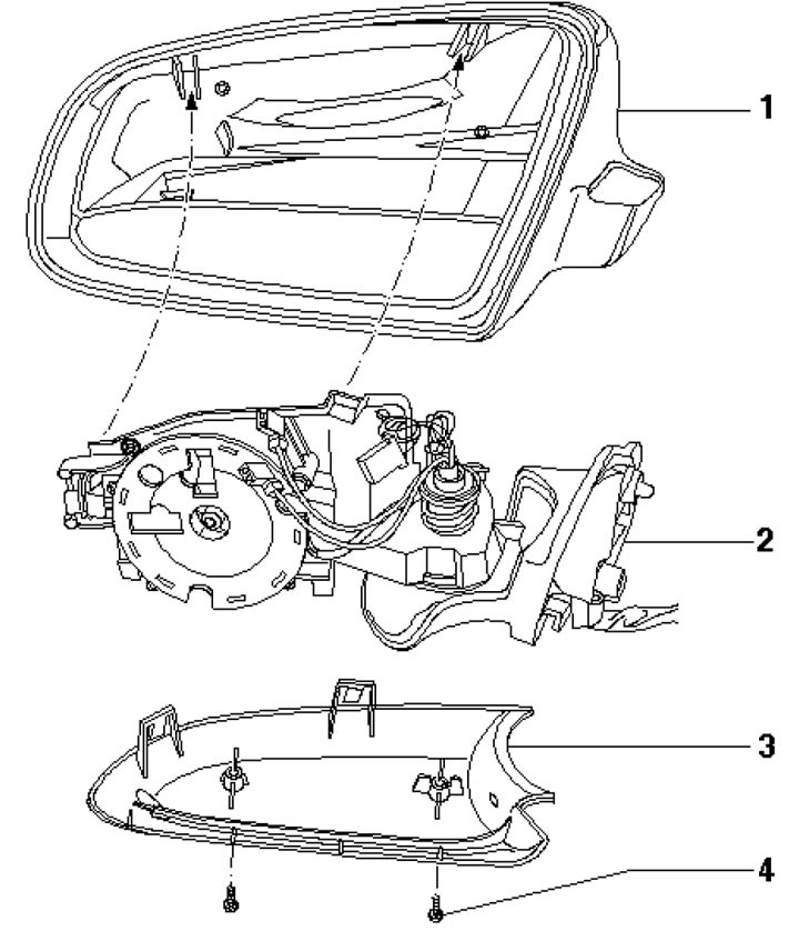 9.3. Elementy montażowe obudowy lusterka wstecznego 1. Obudowa lusterka wstecznego; 2. Jednostka sterująca; 3. Dolna pokrywa; 4. Śruby z podkładkami 1 Nm